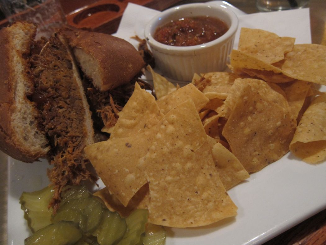 We ordered the pulled pork sandwich ($6) with barbecue sauce and pickles served on a toasted roll with chips and housemade salsa. It tasted a lot like kalua pig — nicely smoked — with just enough barbecue sauce.