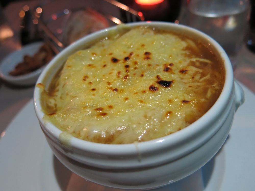 I started with onion soup — I almost ordered "French onion soup" — which was delicate and hearty and not overly cheesy. (Yes, you can actually have too much cheese!)