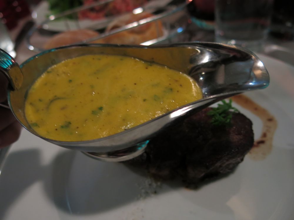 This sauce is made from clarified butter emulsified in egg yolks, white wine and vinegar, then flavored with herbs. It tastes somewhat like a Hollandaise sauce, only better suited for beef.