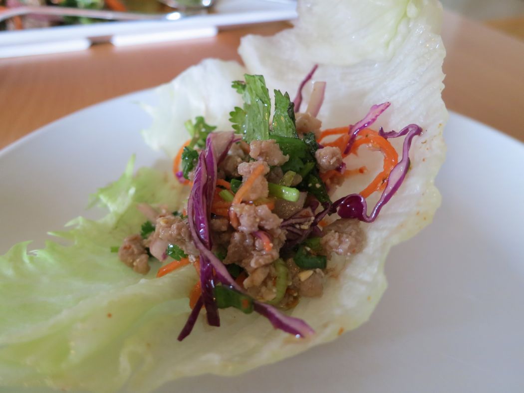 Essentially, these are Thai-style lettuce cups. Larb is a tangy, minced pork salad served with fresh herbs, veggies and toasted rice.