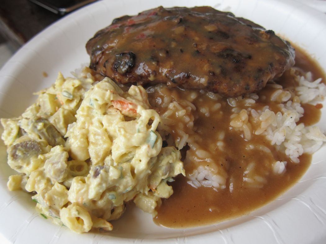 One of my favorite dishes here is the hamburger steak plate with white rice, taro mac salad and lots of gravy. The meat — a 7.5-ounce patty — is sourced from Kuahiwi Ranch located in Kau on the Big Island. All the meat here is hormone- and antibiotic-free, free-range and grass-fed. You can't get better than that.