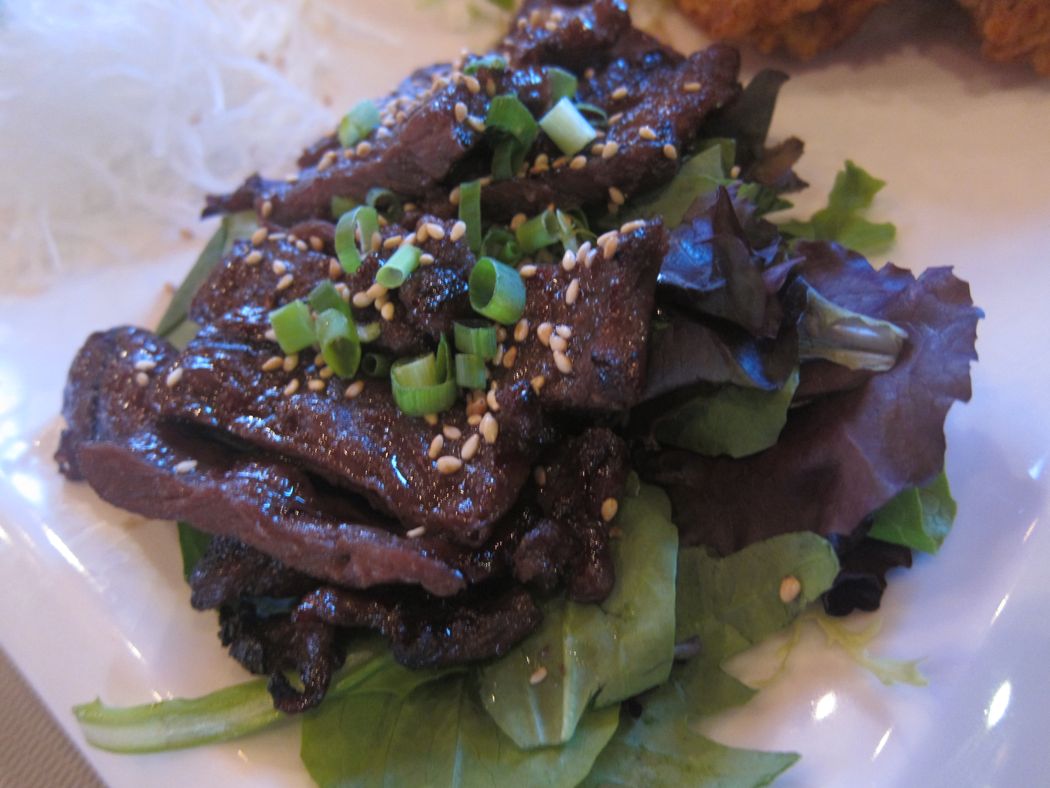 So we peeked in and asked if the restaurant was open. The general manager, Patti Sato, quickly waved us in and got us a table. Turns out, it was the soft opening of Corner Kitchen, a fusion-style restaurant that blends local favorites with an Asian twist. (The sushi bar is opening soon, too.) And there was live music!