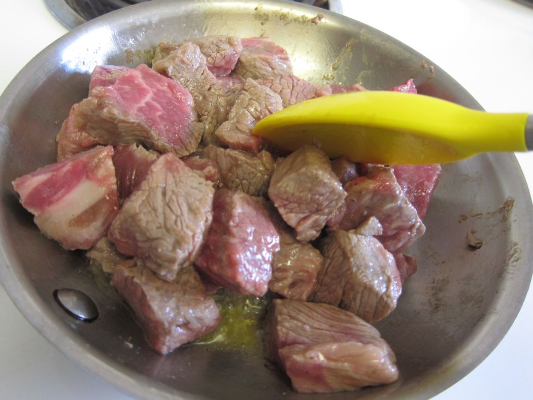 Cut up steak into bite-size chunks and brown in olive oil. Put meat, including the drippings, into the crock pot.