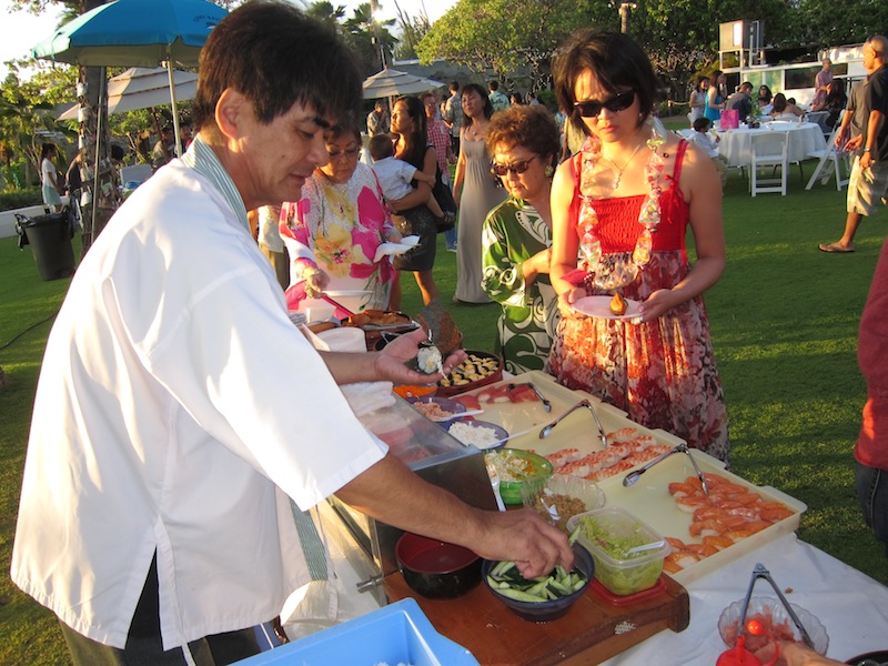 Instead of a buffet, we did food stations, with dishes from Tanioka’s Seafood & Catering, Rainbow Drive-In and Alicia’s Market. We had huli huli-style chicken, Ono Pops and a live sushi chef. And the cake — designed and baked by Aloha Cakery — was really a bunch of beautifully decorated cupcakes with an ocean theme.